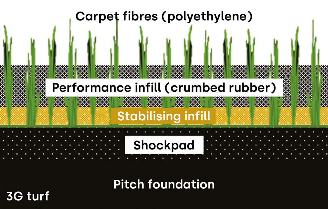 A stabilising infill layer of sand (0.2–1.2mm) is placed at the base, with an upper layer of performance infill made from rubber granules (0.5–2.0mm). Typically, one third of the fibre length protrudes above the infill layer, known as the “free pile height”.